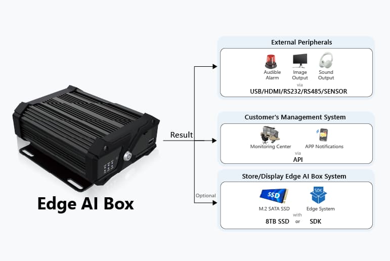 The E-Song Edge AI Box has an independent backend, allowing AI rule setup without coding. After connecting a keyboard, mouse, and display, it functions as an intelligent device, forming a complete AI application system with cameras and other data source devices.